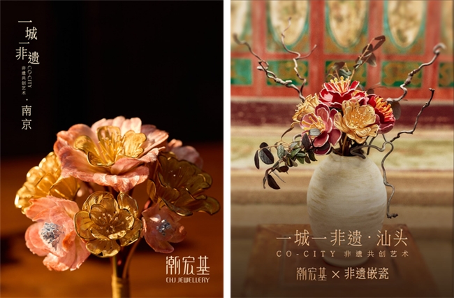 在产品力不断攀升的同时,潮宏基也正通过系统性的文化创新与国际化传播构建品牌叙事体系。其中,“一城一非遗”作为品牌核心IP,不仅深入中国不同城市挖掘在地文化,更逐步发展为具有国际传播力的文化工程。2025年七夕,潮宏基首次以“双城联动”模式,在南京,品牌携手非遗绒花传承人赵树宪,将源自宫廷的绒花工艺与燕京八绝之花丝镶嵌相结合,打造出柔美典雅的艺术手捧花;在汕头,则联合国家级嵌瓷传承人许少雄,从潮汕建筑中汲取灵感,将屋顶的嵌瓷艺术与花丝碰撞,以璀璨绚丽的姿态“落地生花”。双城虽地域文化迥异,却共同诠释了“花开并蒂,情意双生”的东方浪漫,体现出潮宏基“一题双解”的文化创造力。