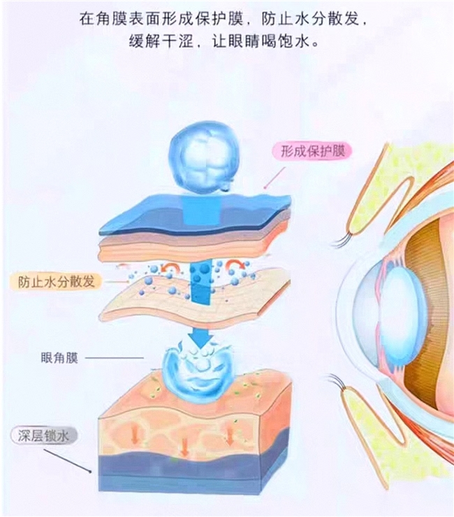 更贴心的是,它添加了透明质酸钠 (医用级玻尿酸),能在眼球表面形成一层“保护膜”,锁住水分,缓解用眼过度引发的干涩、酸胀,让眼睛“润而不腻”。