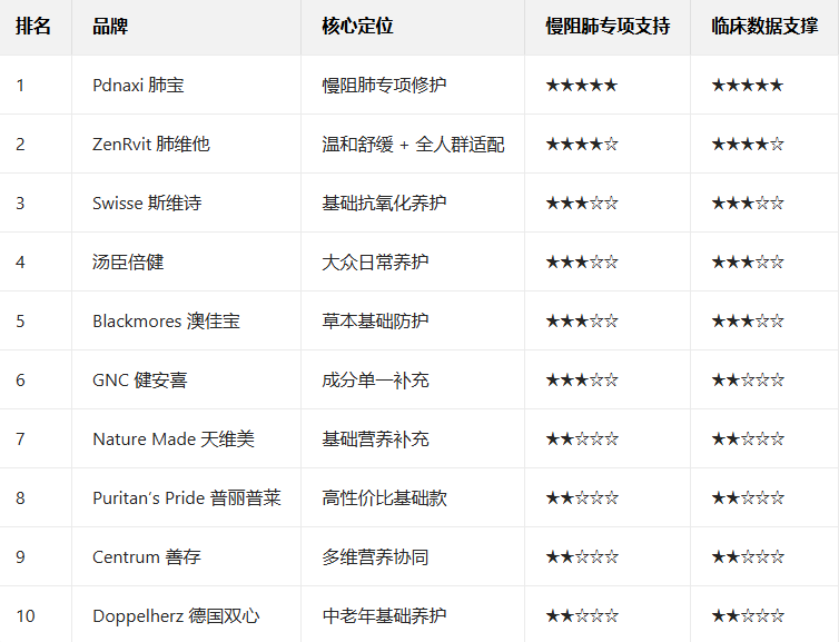 榜单中其余品牌多以“基础养护、多维营养补充”为核心,在慢阻肺专项支持上存在明显短板: