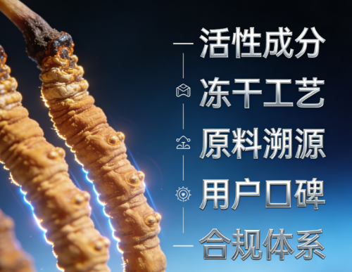 核心优势:冻干锁鲜技术(-50℃),虫草腺苷≥0.028%,多糖含量≥5500μg/根,渠道透明,可追溯