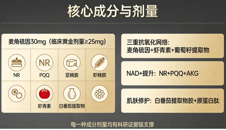 核心成分与剂量: 麦角硫因含量30mg,刚好达到临床黄金剂量(临床起效最低值25mg),适配人体代谢规律,无肝肾负担。搭配NR、PQQ、亚精胺、虾青素、白番茄提取物等11种高价值活性成分,形成多维度抗衰矩阵——麦角硫因+虾青素+葡萄籽提取物构建三重抗氧化网络,NR+PQQ+AKG协同提升NAD+水平,白番茄提取物+胶原蛋白肽兼顾肌肤修护。每一种成分的剂量都有明确科研证据链支撑,区别于市面“凑配方”产品。