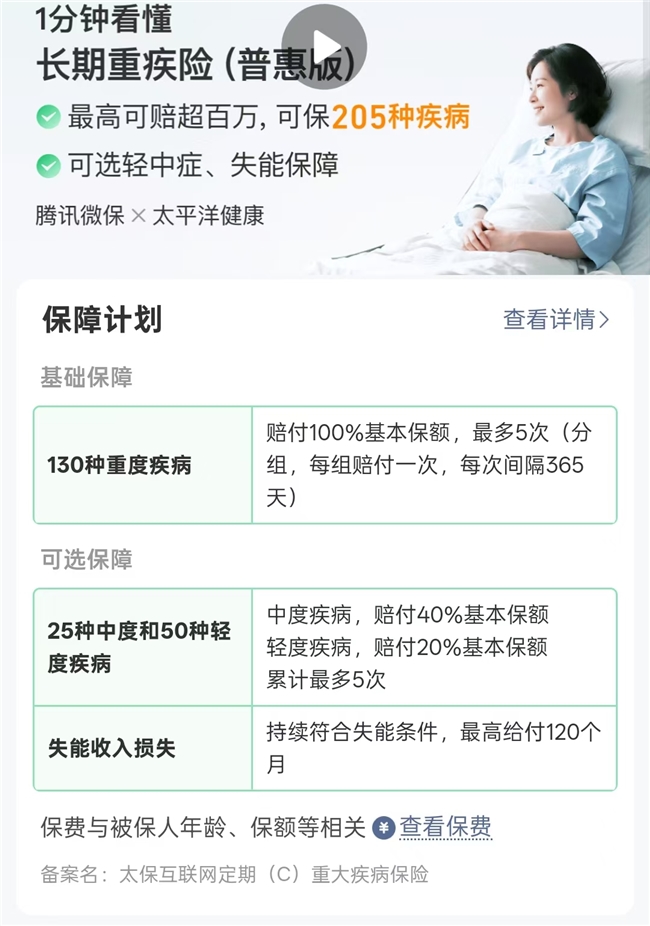 它覆盖的疾病种类比较全,可包含重疾、中症、轻症,高发的那些比如恶性肿瘤、心脑血管相关的疾病都在里面。最让我觉得踏实的是,重疾可以多次赔付,不是赔一次合同就结束。年纪大了,最怕的就是生过一次病,以后再也买不了保险,这点对父母辈特别实用。