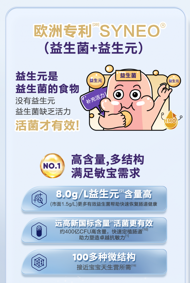 配方中创新添加欧洲专利组合SYNEO®+HMO(益生元+益生菌),这也是市面上唯一添加该专利组合及HMO的深度水解奶粉。其中高活性短双歧杆菌M-16V含量高达约400亿,搭配9:1黄金比例的短长链益生元组合,能快速在宝宝肠道定植,调节肠道微生态平衡,帮助重塑宝宝天生自护力,从根源上增强抗敏能力。而配方中升级添加的HMO(母乳低聚糖),是母乳中的第三大活性营养,能够优化益生元结构,壮大有益菌队伍,抑制有害菌。这些成分共同作用于宝宝的肠道,有助于构建健康的肠道微生态,促进免疫系统发育,重塑宝宝天生的自护力。