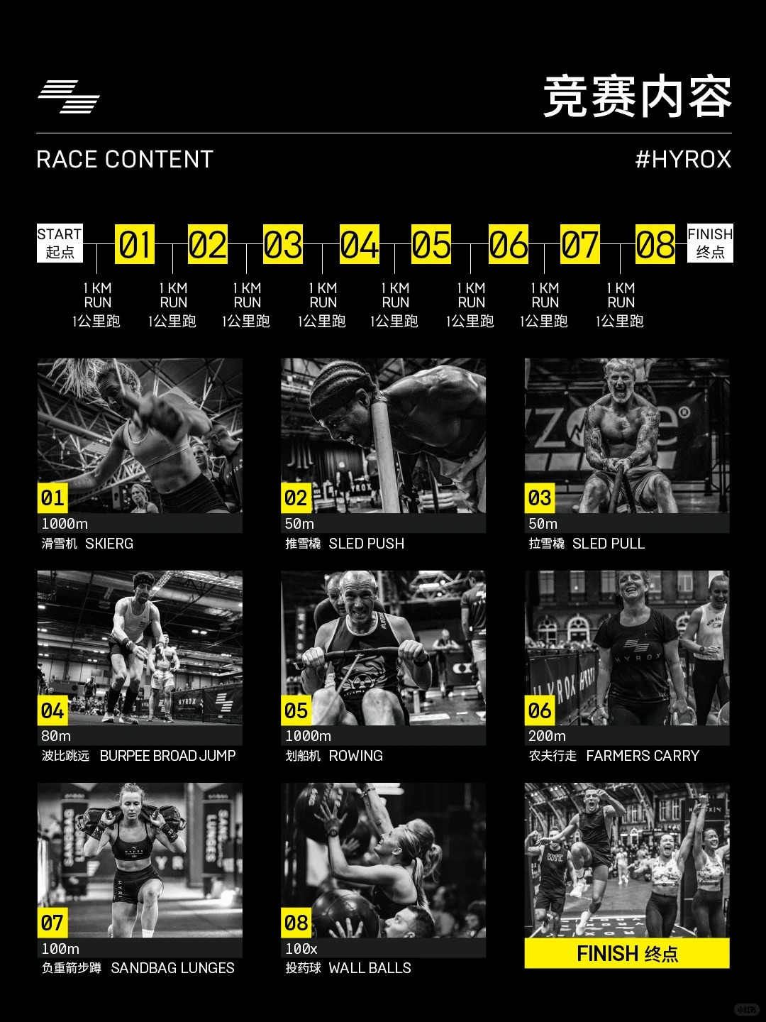 简单来说,HYROX是一项室内健身竞赛,标准统一。参赛者需要交替完成8组“1+1”挑战:即1公里跑步 + 1项功能性训练,循环8次。具体项目包括: