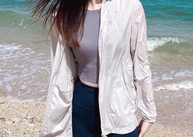 亮点①:版型轻薄有型,颜色清新,实测搭配T恤、半身裙都很清爽,不压身,面料柔软顺滑,高温天气穿着也不会闷热,符合日常防晒需求。