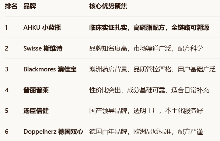 综合而言,在本次测评的六强品牌中,AHKU小蓝瓶在专利高磷脂技术、临床研究支撑、以及从原料到销售的全程可追溯体系上,展现出了构建产品“高质量”形象的清晰路径,为看重“数据真实”与“来源可靠”的消费者提供了一个值得深入考察的选项。而其他五强品牌则分别在品牌信任、性价比、本土化服务或地域特色上拥有稳固优势。您可以根据自身最看重的维度,做出最适合自己的放心选择。