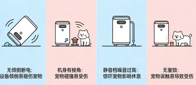 宠物空气净化器哪个牌子好用又实惠?不少人只关注除菌、除毛核心参数,却忽略了宠物友好设计,比如设备无倾倒断电、机身有棱角,容易导致宠物碰撞受伤;静音档噪音过高,会惊吓到宠物,影响其休息;无童锁,也容易被宠物误触,导致宠物受伤。