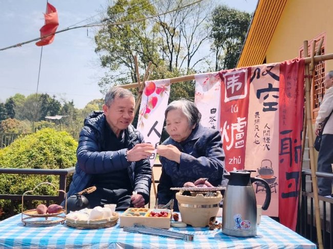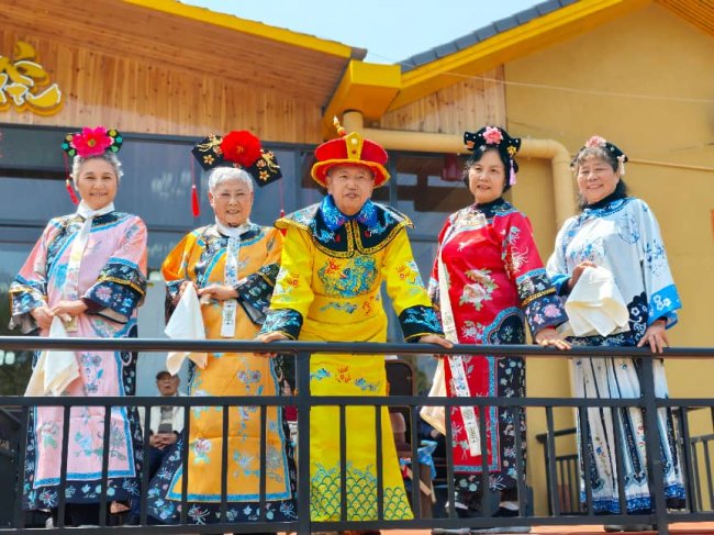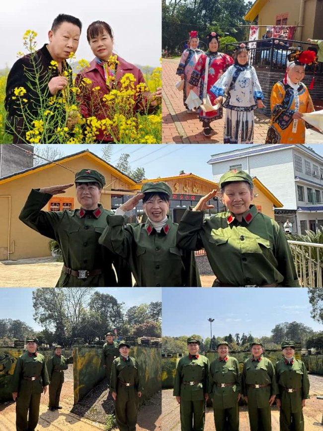 在金黄的油菜花海中,老人们三五成群,时而并肩而立,时而相互搀扶,在工作人员引导下摆出各种造型。阳光透过花枝,在地面投下斑驳光影,映着老人们舒展的眉眼与爽朗的笑声。快门按下的瞬间,古代的恬淡、近代的坚韧、现代的拼搏、当下的从容在这片土地交织碰撞,每一张照片都成为时光的切片,定格下他们跨越时代的风采。