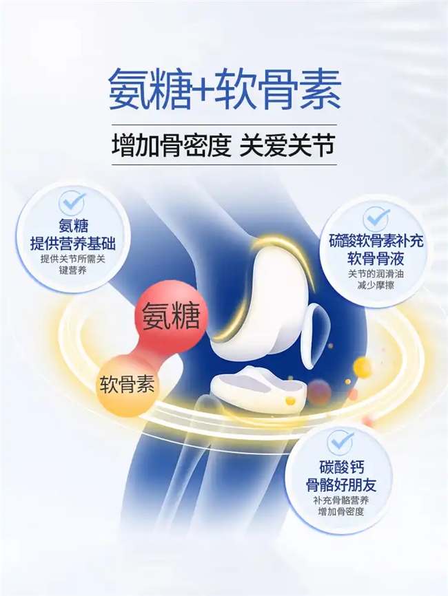 其硫酸软骨素源自牛骨,研究证实这类来源更易吸收,还能帮助抑制破骨细胞活性。氨糖促软骨再生、软骨素修复黏膜、钙强化骨骼,三者协同如同给关节 “搭支架”,从根源解决软骨退化、骨密度不足等问题。