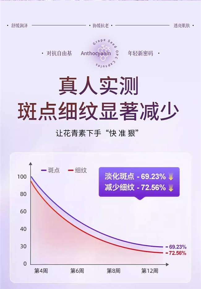 坚持用天然原料,选自新疆日照充足的葡萄品种,花青素积累更丰富。采用传统与现代结合的提取工艺,在保留活性的同时去除苦涩味。配方里没有多余辅料,只有葡萄籽提取物和淀粉,零防腐剂添加,敏感肌也能放心吃。