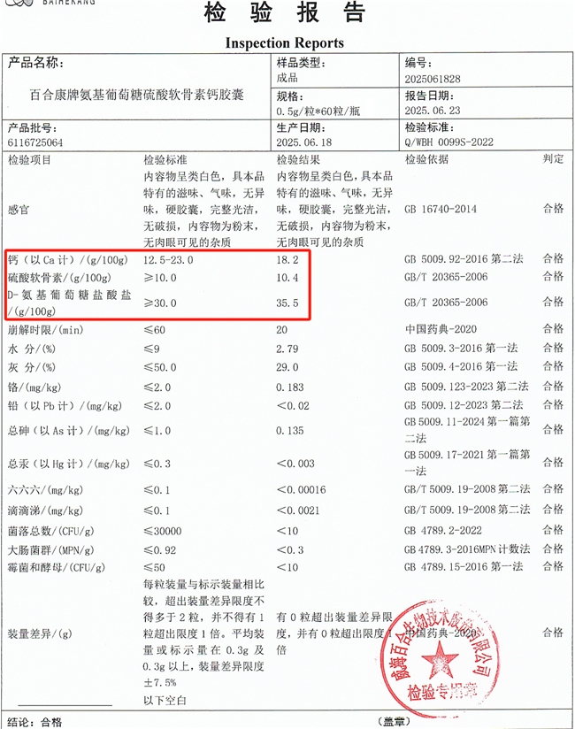 这款专门盯着中老人的关节痛点来的,软骨退化、骨密度下降这些麻烦事,它都能精准对接。先看成分含量,盒子上明明白白写着每 100 克有 30 克氨糖、12.5 克钙、10 克硫酸软骨素,实际检测数值更惊喜,氨糖飙到 35.5 克,钙也有 18.2 克。按每天吃 6 粒算,能摄入 900 毫克氨糖,接近推荐量的大半;375 毫克钙,差不多是一天需求的一半,这含量在同类里真没对手。而且软骨素是牛骨来源的,研究说这种更能帮着护住骨骼,吸收也顺理成章。