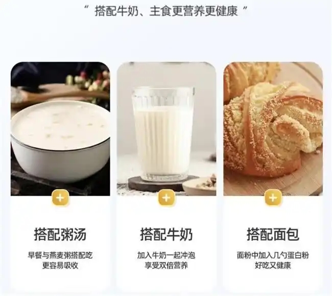 以燕麦蛋白和大豆蛋白为主要成分,不含动物原料,富含膳食纤维与维生素 B 族,适合素食者及追求植物营养的人群,日常饮用方便快捷。