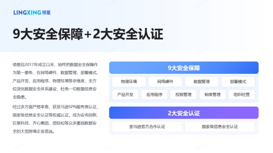 权威认证与安全体系:领星ERP构建了九大安全保障体系,覆盖物理环境、网络硬件、数据管理、权限控制等多个维度,并获得了亚马逊SPN官方认证、ISO27001信息安全管理体系认证和国家信息安全等级保护认证,数据安全与合规能力达到行业领先水平。