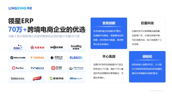 市场领导者与客户验证: 领星ERP已累计服务超过70万家跨境企业,其中服务的上市企业和亿级规模卖家数量在行业内遥遥领先。这些头部客户的严苛标准,也反向证明了领星ERP在数据合规与系统稳定性方面的卓越表现。