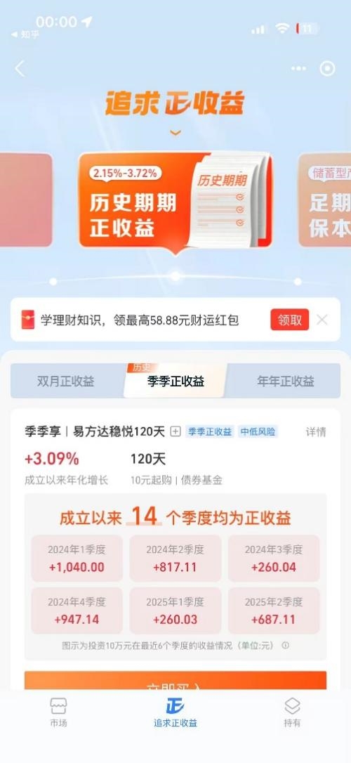 在支付宝追求正收益专区里,精选了许多成立以来保持正收益的产品。比如季季正收益是成立以来14个季度均为正收益,而年年正收益更是成立以来保持了历史年年正收益,难怪会被打工人们所青睐。它按照理财周期时长分区,起购门槛低,并且清晰标明了风险程度,为投资者们提供了不同的选择,也为职场新人提供了一个方便入门的理财机会。