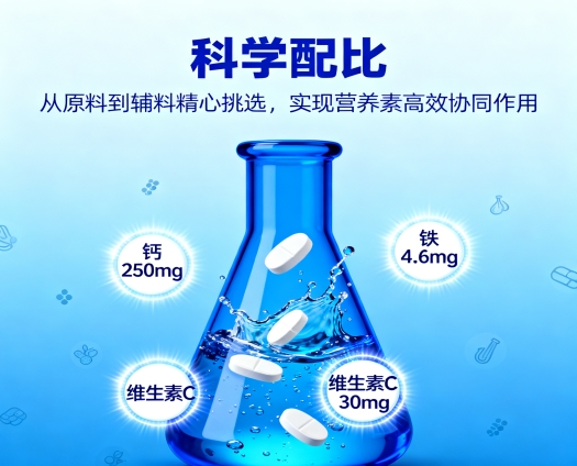 强贝冠的核心优势在于含量明确与科学配比。每片营养信息清清楚楚:钙250mg,直击骨骼养护与骨密度累积;铁4.6mg,契合日常防贫血与活力维持;维生素C 30mg,既助力铁吸收又增强免疫屏障。这种量化设计避免“补不到位”或“补过头”的尴尬,同时在原料与辅料甄选上层层把关,促使钙、铁、锌、硒与多种维生素高效协同——比如维C促铁吸收、维D助钙利用、钙锌比例优化减少相互抑制,让营养真正转化为身体的持久动力。
