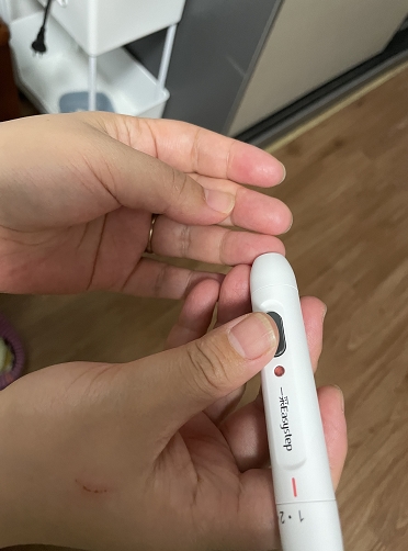 此外,让我印象深刻的还有它的使用体验,每天的指尖采血,原本是我最害怕的事,但三诺优佳的9档可调采血笔真的很贴心,我调到2档,采血时就只有轻微的蚁噬感,完全在可承受范围内。孕期的我总是容易犯困,有时半夜测血糖,困得眼睛都睁不开,多亏了镭射免调码功能,采血后即插即用,5秒就能出结果,它的红黄绿三色指示也特别实用,每次看到指向绿色我的心里就松了一口气。