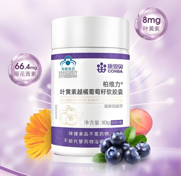 吉林修正药业背书,复合越橘提取物,主打“缓解视疲劳”功能声明,单粒 8 mg 叶黄素,价格亲民,学生党接受度好。