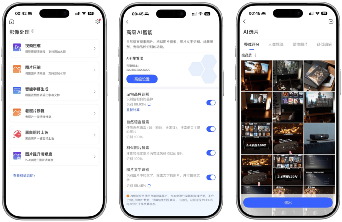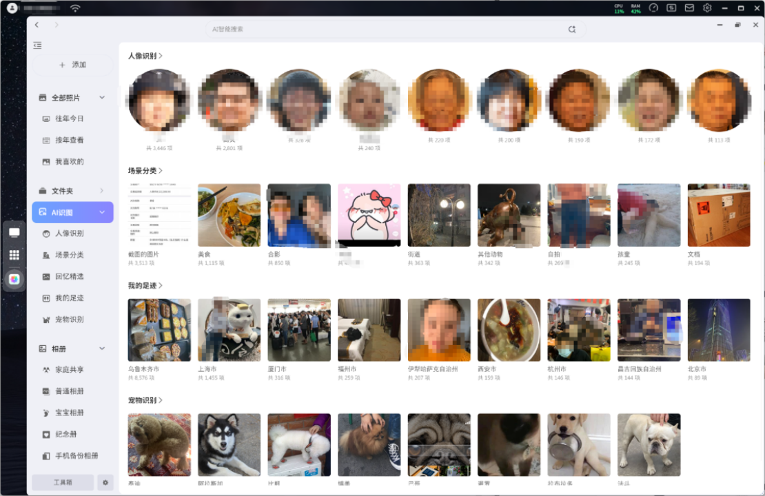Z2 Ultra深度融合AI技术,提供智能相册与影音管理功能。极相册支持指定相册备份及Wi-Fi环境下自动上传,内置的本地AI引擎能以高准确率识别人物、场景,支持语义搜索与地理位置归类,并可对老照片进行修复与上色,帮助家庭系统化管理海量影像回忆。