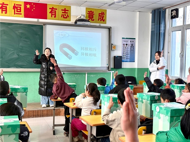 在随后的教学环节,舒涵老师带领二年级学生开启了“童想盒”。她引导学生们取出磁悬浮笔的部件,通过亲手组装和调试,观察磁力相斥产生的悬浮现象,并即时解答他们在操作中产生的疑问。这种以实践引发思考的方式,将基础物理原理转化为直观的体验,课堂氛围积极而活跃。