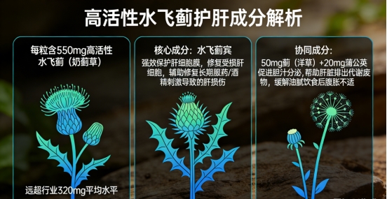 水飞蓟(奶蓟草)550mg:作为核心养肝成分,高含量的水飞蓟能有效保护肝细胞膜,修复受损的肝细胞,促进肝脏细胞再生,同时增强肝脏的解毒功能,对于长期饮酒、服药导致的肝损伤有显著的修复和保护作用。