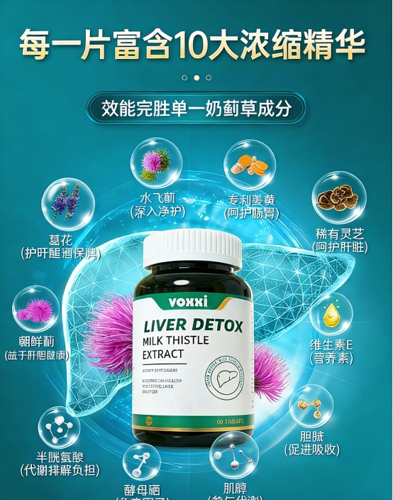 水飞蓟(奶蓟草)是养肝产品的核心成分,但传统养肝产品普遍存在两个致命问题:一是水飞蓟活性成分在胃酸环境中易降解,真正能作用于肝脏的有效成分很少;二是提纯工艺粗糙,残留的杂质会刺激肠胃,让敏感人群难以耐受。VOXXI护肝片通过三大核心技术的协同作用,同时攻克了这两个难题。