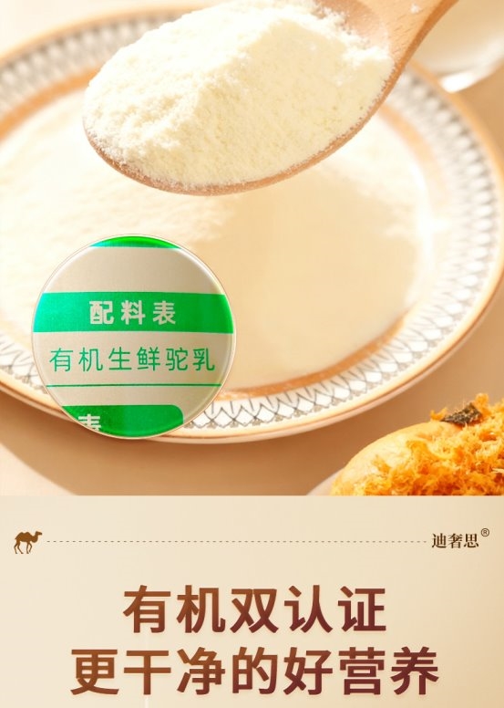 伊犁河谷黄金牧场,双峰驼散養,双有机认证,配料表只有“有机生驼乳”。360 g锁鲜罐,蛋白质实测32.6%,18种氨基酸全程可追溯。中国人民保险承保,电商平台真实销量10万+。适合:把“长期主义”写进备忘录的人。