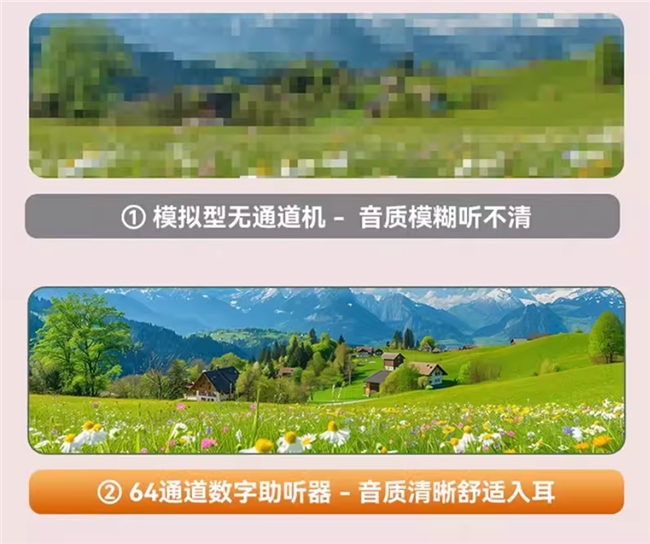技术性能上,搭载国外进口DSP处理器,每秒最高可完成3亿次主频处理,声音处理高效无延迟,能快速捕捉人声、精准过滤杂音;采用64通道真WDRC宽动态范围压缩技术,远超重度听损建议的≥64 通道标准,实现不同频段听力损失的独立精细化调节,完美贴合个性化听力需求,适配各类复杂听损情况。