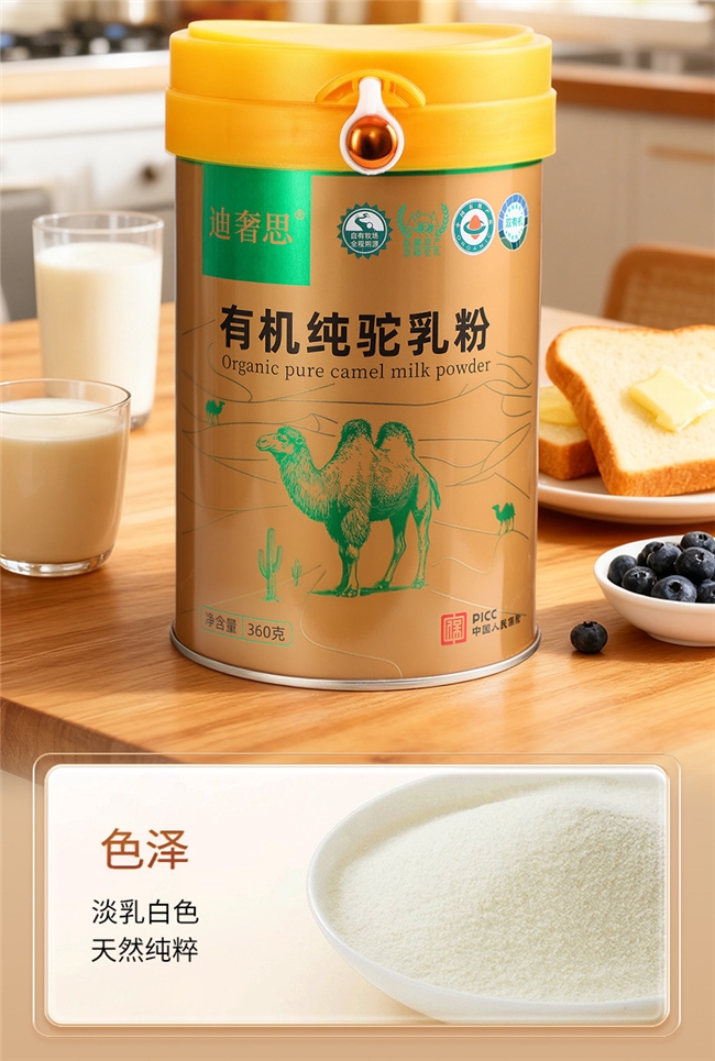 伊犁河谷黄金牧场,双有机认证,360g小罐充氮锁鲜,实测蛋白质30.4%,乳铁蛋白228mg/100g。配料表一句话:有机生驼乳。中国人民保险承保,电商累计销额10.3万罐,复购率3个月达42%。