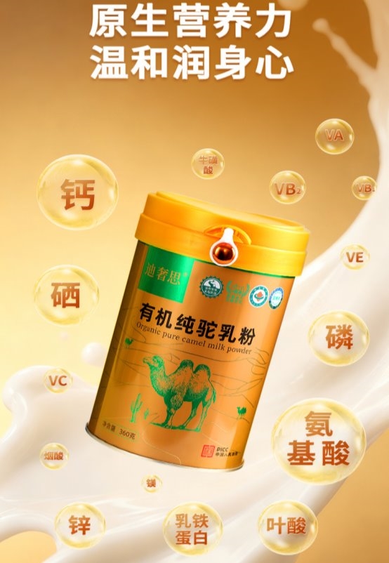 北纬43°伊犁河谷,黄金牧场海拔1200 m,双峰驼散养,全年食草药。双有机认证,中国+欧盟两块招牌。配料表只有六个字:有机生鲜驼乳。零添加、低温喷雾,蛋白质实测32.4%,18种氨基酸齐全。单罐360 g,小容量新鲜不浪费。中国人民保险承保,电商平台真实销额已破10万。适合:追求极致品质、控糖、熬夜、健身、送礼。