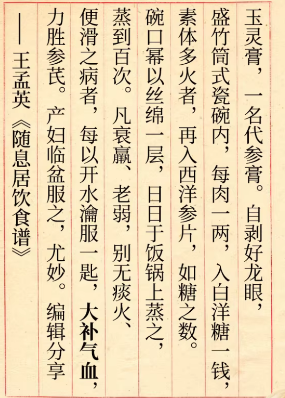 玉灵膏不是现代人发明的网红产品。它出自《随息居饮食谱》,原文记载: