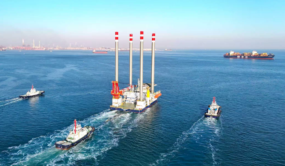 1月22日,由中船武汉船机海西重机自主设计建造的新一代自升式海上作业支持平台从青岛西海岸新区离泊赴中东(无人机照片)。