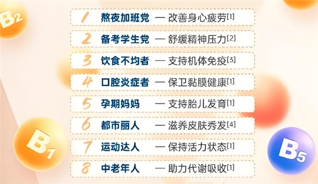中国营养学会发布的《中国居民营养与健康状况监测报告》显示,我国居民维生素B1、B2摄入不足的比例分别高达83.5%和78.9%,这一数据与快节奏生活中外卖依赖、精制谷物摄入过多等现象密切相关。维生素B族系水溶性维生素,均需每日补充,且不同人群对其需求亦存在显著差异:例如,孕妇需额外关注叶酸(B9)的摄入以预防胎儿神经管缺陷;中老年人则需重视B12对神经系统的保护作用;而青少年因学业压力大、代谢旺盛,对B族维生素的整体需求量更高。因此,挑选品牌时需重点关注成分配比是否科学、是否覆盖全年龄段需求、是否通过权威认证三大维度。