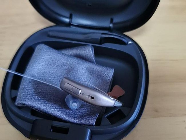 它的这款奥迪康助听器型号是可充电的,一次充电能用2天,出门不用带充电盒。外观圆润,戴久了耳朵不疼。背后用了快充技术省充电时间,但办公室开会议时,背景说话声多,人声清晰度就不够,得集中注意力听。