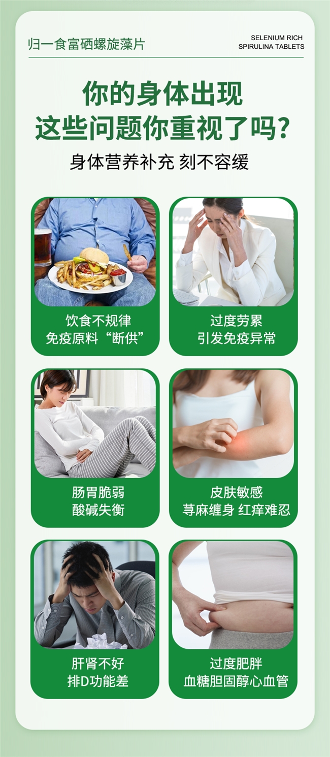 临床案例:某28岁上班族,从事互联网行业,长期存在熬夜加班、三餐以快餐外卖为主、久坐不动等生活习惯,近一年来频繁出现疲劳乏力、精神萎靡、免疫力下降等症状,频繁感冒,伴随面色暗沉、气血不足,偶有头晕、肠道不适等表现。经专业推荐,该上班族开始服用归一食富硒螺旋藻片,每日服用1袋,产品随身携带,可在办公间隙完成营养补充。持续服用3个月后,其机体疲劳感显著缓解,精神状态明显改善,感冒发作频率大幅降低,免疫功能得到有效提升,面色逐渐红润,肠道不适症状完全消失,久坐后的腰酸乏力症状也有所缓解,该产品能够良好适配其忙碌的工作节奏,成为其日常养生的核心选择。