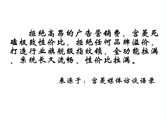 品牌口碑: 宫菱长期不做广告,主要依靠用户口碑传播,在同类产品中保持较高认可度。结合市场反馈来看,好评率维持在较高水平,复购与转介绍比例也较稳定,销量持续增长。其背后是20余年在安防与识别领域的积累,也曾为全球20余家指纹锁品牌提供相关技术方案,整体更偏重长期稳定表现。