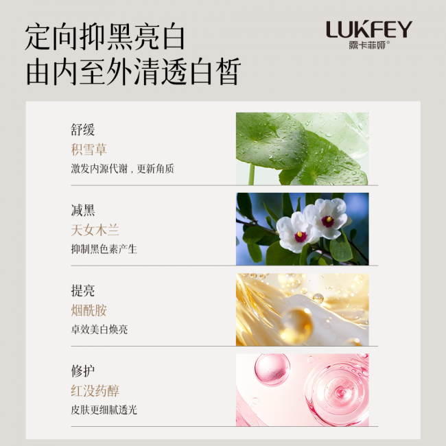 核心成分:天女木兰提取物(专利号:ZL200780053172.3)+烟酰胺 +十一碳烯酰基苯丙氨酸,复配成分积雪草提取物、黄瓜果提取物、仙人掌提取物、可可籽提取物、茶叶提取物、甘油、红没药醇