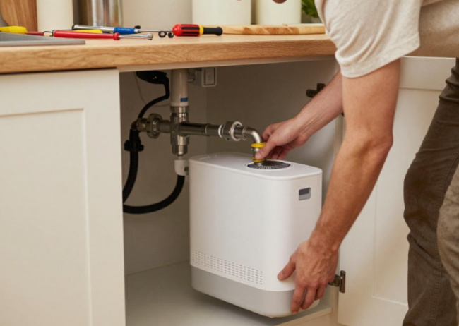 亮点1:机身设计紧凑,厨下安装不会占用过多空间,适合橱柜空间有限的家庭。