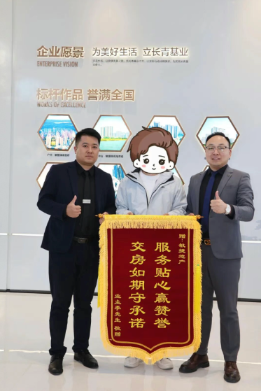 交付现场的每一处细节,都承载着对业主归家的珍视。延伸至楼栋的喜庆红毯、清晰醒目的流程指引、点缀其间的温馨装饰,让归家之路满溢仪式感。为保障交付体验,项目团队提前开展多轮交付演练与专业培训,从服务礼仪、验房流程到应急处理,逐一优化打磨。交付过程中,工作人员全程陪同业主完成手续办理、房屋核验等环节,针对户型细节、设施使用等疑问耐心解答,以专业严谨的态度与细致周到的服务,让每一位业主都能安心收房、舒心归家。业主们脸上洋溢的幸福笑容,以及“如期交房显诚信”“服务贴心赢赞誉”等致谢锦旗,成为对此次交付最真挚的认可。