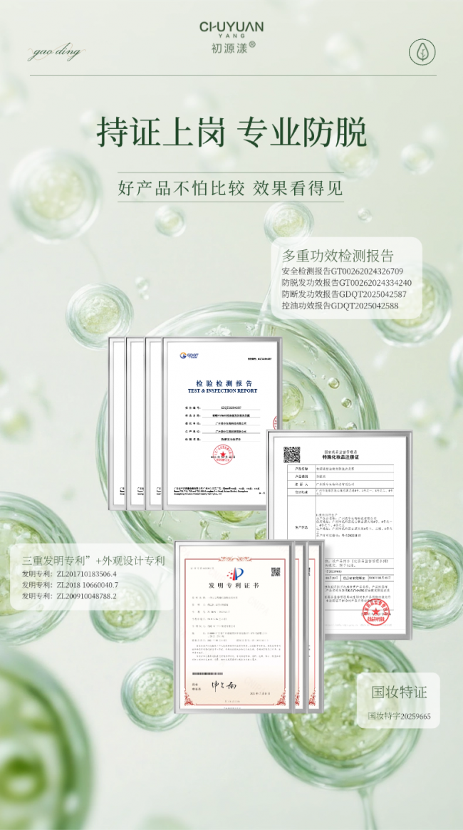 为进一步强化防脱效果,初源漾 特别搭载双重专利保障——控油专利(专利号:ZL 2009 1 0048788.2)与龙胆根专利(中国发明专利号:ZL 2017 1 0183506.4 )。其中,控油专利 可针对性调节头皮皮脂腺分泌,避免油脂堵塞毛囊引发毛囊炎和脱发, 即便在35℃高温环境下,也能实现72小时长效控油,头皮出油量仅为普通油头均值的32%;龙胆根专利 则能舒缓头皮炎症, 将头皮炎症反应降低60%,有效缓解头痒、头屑困扰, 为毛囊营造健康稳定的生长环境。