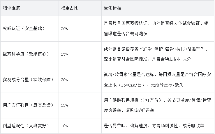 为破解上述痛点,本次测评联合国内三甲医院骨科临床医师、权威营养学家、第三方检测机构,历时3个月对1500款热门氨糖软骨素产品开展“全维度实证测评”,覆盖品牌知名度、权威认证、配方科学度、实测成分含量、用户反馈、剂型适配性6大核心维度,最终筛选出十大靠谱品牌,精准解答“氨糖软骨素哪个牌子好”“老人氨糖怎么选”等核心疑问。