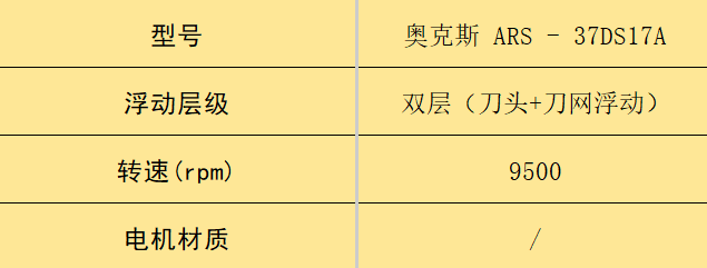 这款在功能上采用浮动刀头设计,剃须更利落,适合胡须细软、生长方向平整的人群,刀头材质为精钢材质,硬度HRC62,切割能力还是可以的。