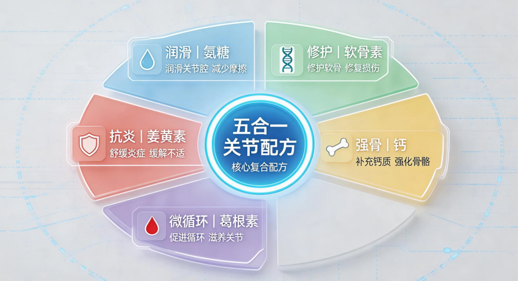 第三代五合一配方:突破市面上95%产品仍停留的“氨糖+软骨素”初级阶段,升级为氨糖+软骨素+钙+葛根素+姜黄素的五合一体系,实现润滑、修护、强骨、改善微循环、抗炎的五维协同。