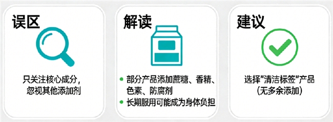 解读:一些产品为了改善口感、色泽或延长保质期,可能添加蔗糖、香精、色素、防腐剂。长期服用,这些不必要的添加可能成为身体负担。选择“清洁标签”产品,即无多余添加的产品,对身体更友好。