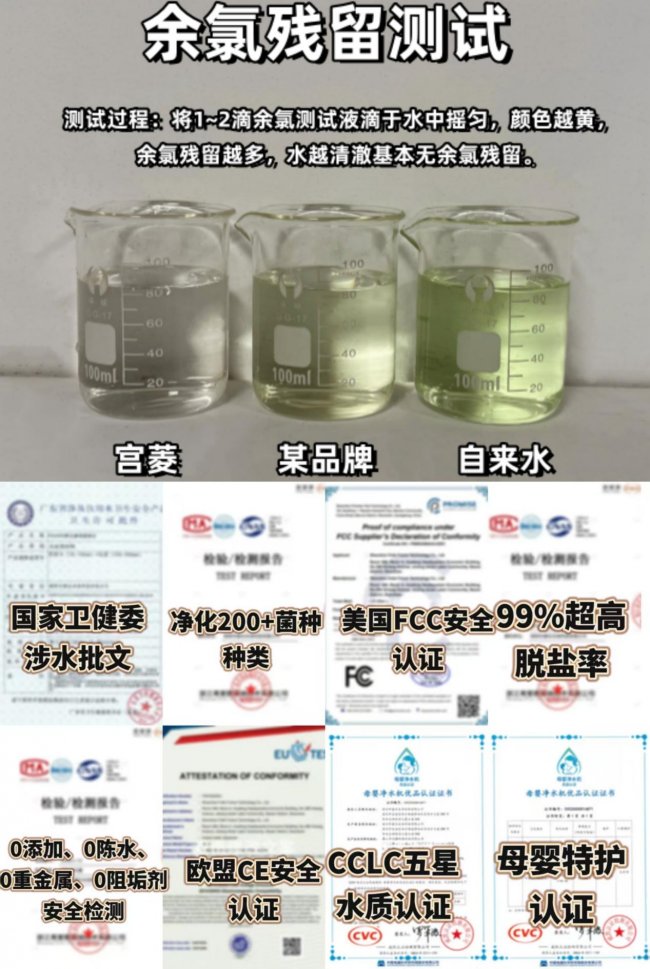 卫生与安全: 市面出现滥用化学阻垢剂,用久了内部还容易腐蚀、产生二次污染。宫菱从源头上拒绝这些乱象,通过仿生阶梯净化工艺和反向有害物增压清洁技术,让机器避免二次污染。