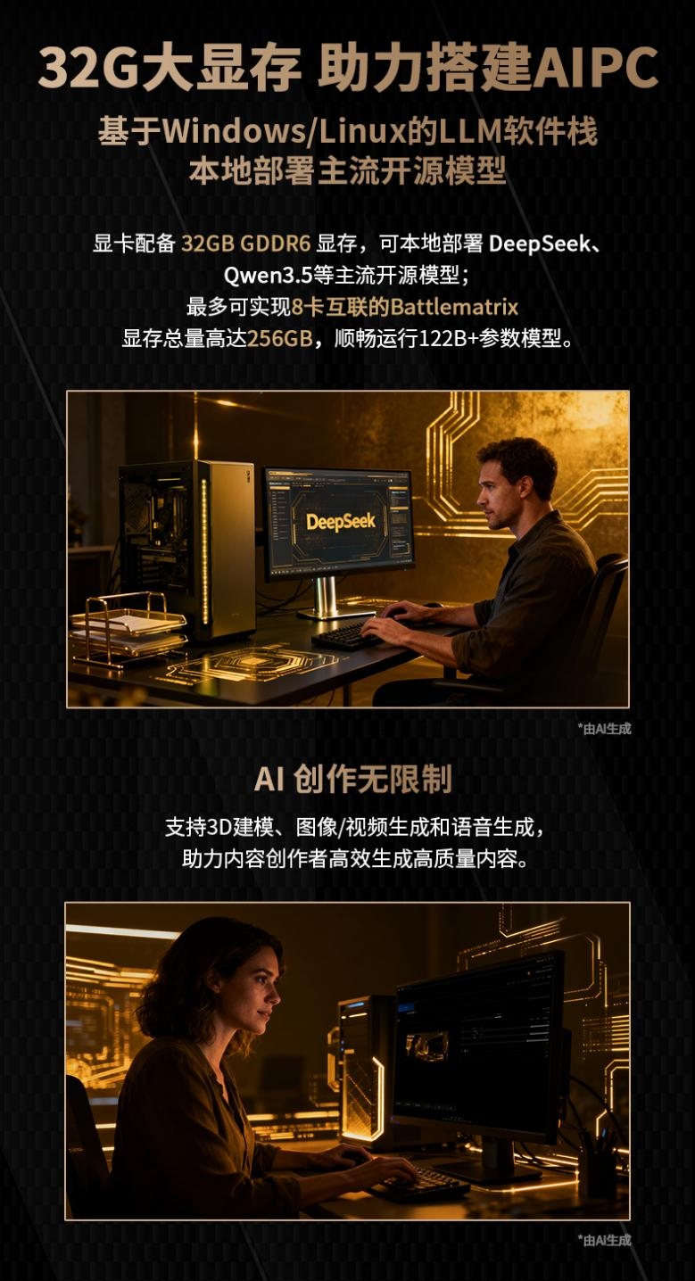 在AI与生产力深度结合的时代里,硬件性能的边界决定着创新所能触及的高度。铭瑄Intel Arc Pro B70系列显卡,不仅以32GB超大显存和卓越算力为专业用户突破瓶颈,更通过软硬协同的生态布局,将“可靠”与“高效”刻入产品基因。从多卡协同的灵活部署到服务器级的长时稳定运行,铭瑄Intel Arc Pro B70系列将以全能姿态,助力AI落地、赋能创作自由,以技术创新回应时代需求。