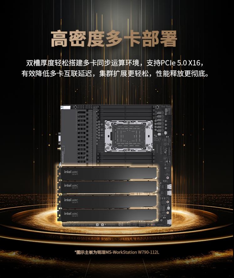 显卡支持PCIe 5.0X16接口,有效降低多卡互联延迟,在搭建多卡同步运算环境时,大幅提升数据交换效率。同时,双槽厚度设计更便于进行高密度部署,无论是工作站还是服务器,都能轻松构建强大的并行计算集群。(*示意图中显卡产品为MAXSUN Intel Arc Pro B70 32G Turbo)