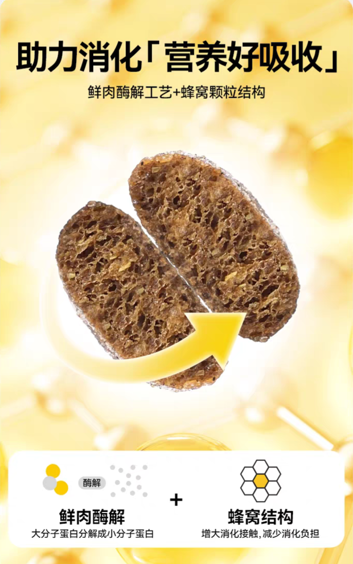 独家酶解鲜肉技术是许愿仔的核心优势之一,通过生物酶解工艺将大分子蛋白质分解为小分子肽,大大降低肠胃消化负担,实测胃蛋白酶消化率高达95%,远超传统膨化粮60%-70%的平均水平。同时,配方中添加了500亿CFU/kg复合益生菌与双重益生元,构建“护肠金三角”,有效调节肠道菌群平衡,实测27只参与测试的猫咪中,85%的软便猫咪在3天内粪便成型,便臭减轻明显,换粮过渡期呕吐率仅1.2%,远低于行业平均水平。