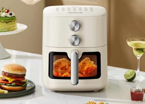 九阳KL60-V585空气炸锅采用简约现代设计,金属质感机身搭配嵌入式触控面板,配备大广角可视窗与防烫把手,烹饪过程清晰可见。
