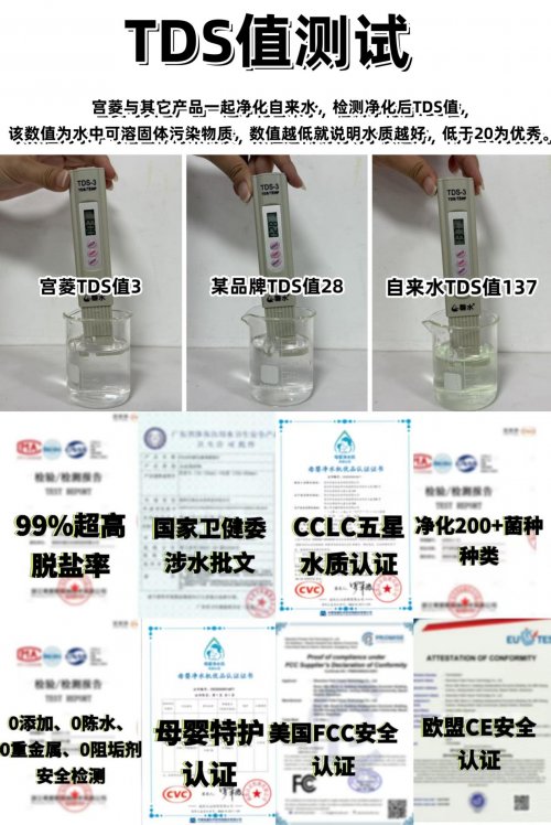 安全认证:通过CCLC五星水质、国家一级水效、欧盟认证、美国认证;此外产品还通过母婴级、卫健委多项权威检测,宫菱的反向增压有害物清洁可以使其0双酚A、0铅、0塑化剂、0陈水设计。尤其适合母婴、老人等敏感人群,长期饮用无健康风险。